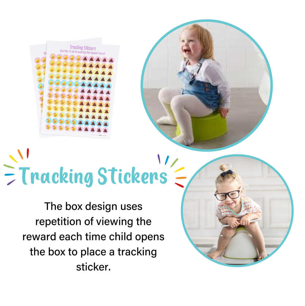 Potty Prizes builds confidence in your child by placing a sticker and earning rewards. It becomes a game instead of a tug of war trying to convince them to use the potty. It entices them to keep trying by viewing the rewards they are working towards each time they open the box to place a tracking sticker!